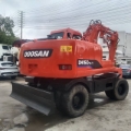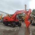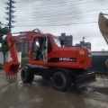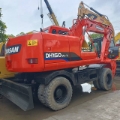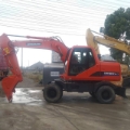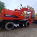 Doosan DH150W-7 Wheel Excavator Specifications 1. Basic Information • Model: Doosan DH150W-7 • Class: 15-ton class medium wheel excavator • Operating Weight: 12,900 kg • Standard Bucket Capacity: 0.57 m³ (range: 0.28–0.75 m³) • Boom / Arm Length: 4300 mm / 2100 mm, 2500 mm (optional) • Tail Swing Radius: 2210 mm • Gradeability: 70% (35°) • Minimum Turning Radius: 7.7 m • Country of Manufacture: China (Yantai, Shandong) 2. Engine • Model: Doosan DB58TIS • Type: Inline 6-cylinder, water-cooled, turbocharged, direct injection diesel engine • Rated Power: 96 kW @ 2200 rpm • Bore × Stroke: 102 × 118 mm • Displacement: approx. 5.8 L • Emission Standard: China Stage III (Tier 3) 3. Hydraulic System & Performance • Main Pump: 2 × variable displacement axial piston pumps • System Pressure: 32.5–34.3 MPa • Travel Speed: 10 / 37 km/h (low / high) • Swing Speed: 12.5 rpm • Bucket Digging Force: 77 kN • Arm Digging Force: 62 kN • Max. Drawbar Pull: 62 kN 4. Working Dimensions (Standard 4300/2100 mm) • Max. Digging Radius: 7530 mm • Max. Digging Depth: 4615 mm • Max. Digging Height: 8015 mm • Max. Dumping Height: 5630 mm • Max. Vertical Digging Depth: 4086 mm 5. Overall Dimensions • Shipping Dimensions (L×W×H): 7290 × 2496 × 3640 mm • Cab Height: 3116 mm • Wheelbase: 2800 mm • Track Width: 1914 mm • Tire Size: Standard 12.00-20 / 11.00-20 • Min. Ground Clearance: 350 mm • Counterweight Ground Clearance: 1241 mm 6. Fluid Capacities • Fuel Tank: 280 L • Hydraulic Tank: approx. 170 L • Engine Oil: approx. 16 L